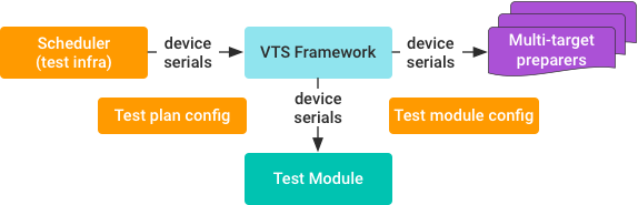 El framework ejecuta preparadores de pruebas para todos los dispositivos de los que recibió números de serie. Los preparadores de destino pueden ser de un solo dispositivo o de varios dispositivos: