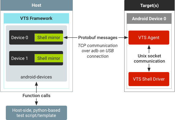 El controlador de shell de VTS es un agente binario que se ejecuta en el dispositivo y ejecuta comandos de shell. De forma predeterminada, VTS usa el controlador de shell si se ejecuta en el dispositivo, ya que este método tiene menos latencia que usar el comando adb