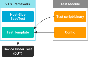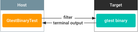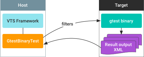 En VTS, el formato de prueba predeterminado son las pruebas de Python del host que se extienden desde BaseTest en el ejecutor de VTS. Para integrar pruebas del destino, primero debes enviar los archivos de prueba al dispositivo, ejecutar las pruebas con comandos de shell y, luego, analizar los resultados con secuencias de comandos de Python del host.